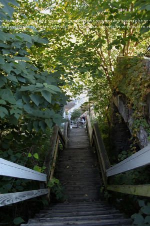 The town is quite literally built into the mountain terrain, so many of the buildings have street level entrances on multiple floors, there are no ninety degree angle intersections because the streets run with the hillsides, and there are long staircases intermittently throughout town for pedestrians, thus its nickname The Stairstep Town.