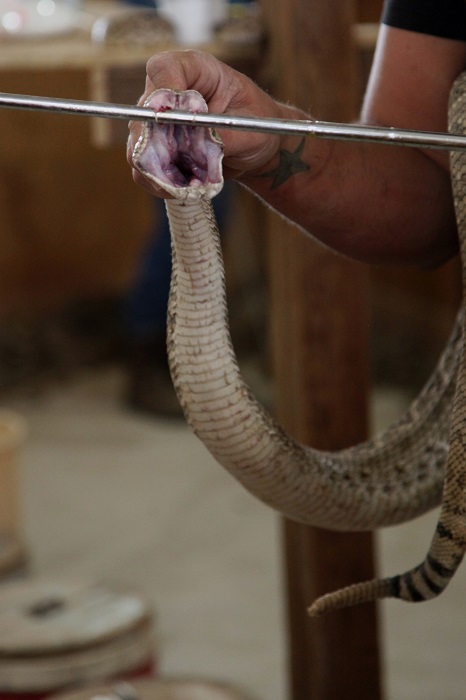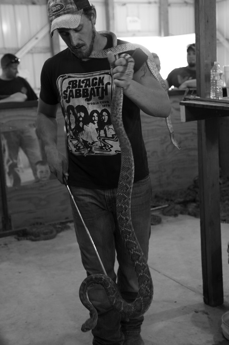 one with the longest rattle. The more impressive snakes are auctioned off and of course snakes are butchered for their meat, which I had always been told was amazing and had never gotten round to trying. This year though the lure of the smoker out back of the Den of Death was too much and was a welcome break from the humid hanging heat inside where the crowd oh’ed and aw’ed the size of the year’s snakes.