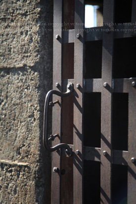 A building certainly not used for its original purpose is the 1918 jailhouse located just south of Route 66, currently used as storage for the houses around it. I cannot make that up, really. With lawnmowers and plastic storage tubs packed inside the old cell and the houses and trailers directly surrounding it, the best I could do for sharing it here were close ups of the window and door details.