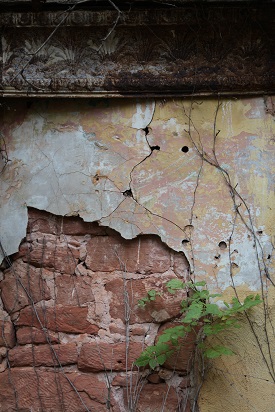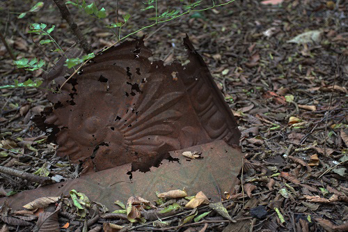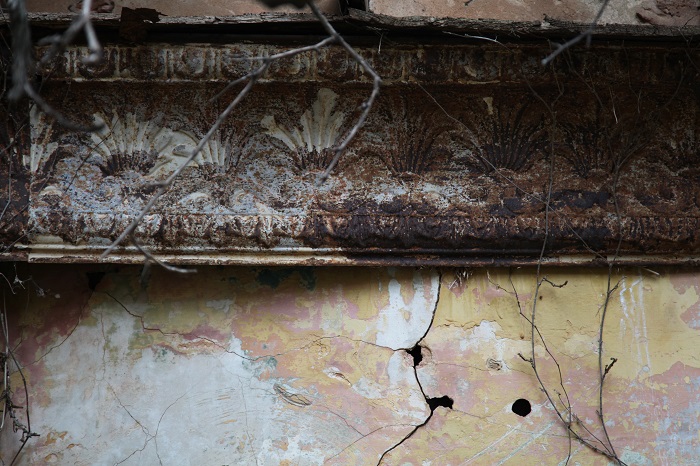 • Thank you sweets. That is ceiling tin and a piece of the tin molding from the walls. If you look at the main photo and the three beneath the one you asked about you can see parts of the tin molding still attached and in some of the color photos you can make out where a mural was once painted.