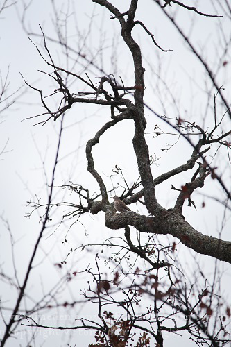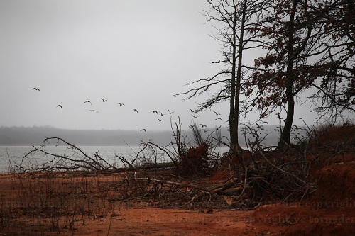 Out of town, a county over, and down a once back road now developing until it dead ended into vast glassy gray. At a reasonable looking turn, we found a place to park and disappeared along the drought lengthened shoreline, tracing various animal tracks along the sandy clay that hides when the rare rain comes. That red sandy clay that will be on our boots until the day they fall apart; the red dirt gets in you when you live here. Up narrow hiking trails into the brush, the trees were still broken in a short path line here from a tornado none too recent. Mulberry vines had crawled up them and through the splintered branches and trunks. Quiet and still, we listened and watched, the light crunching sound of hooves, flickering songbirds, bold red streaks of cardinals, and the intermittent distant laugh of a mallard. A squirrel was scampering about fifteen feet to the right. The air was frozen and sound carried far.