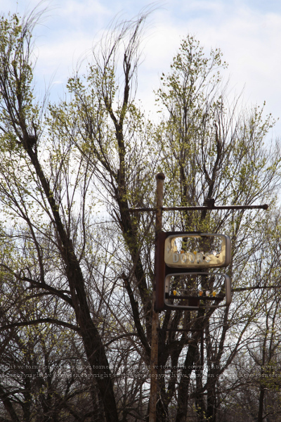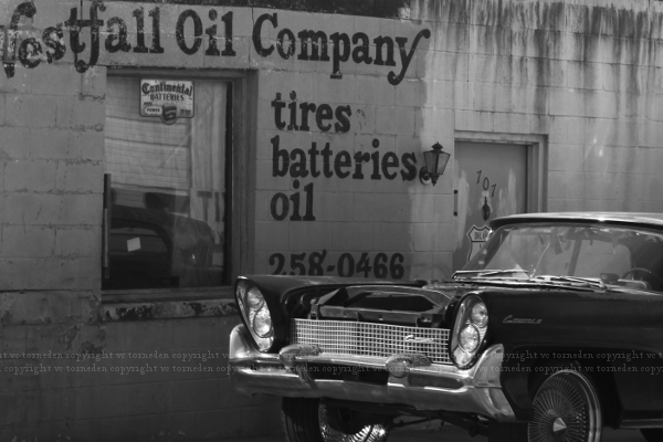 The former garage still sat silent, a rusted out Ford rotting in front, the sign post and its frame coated in vermillion patina, the light sockets long empty.